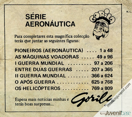 - Cromos das pastilhas elásticas Gorila. Oferta no interior (invólucro) das pastilhas. Não tem Caderneta. Segundo o MJ apurou não foram editados todos os 809 cromos e alguns números são repetidos mas com imagens diferentes. Ver imagem para ver a referência dos números dos cromos com os temas da colecção. |